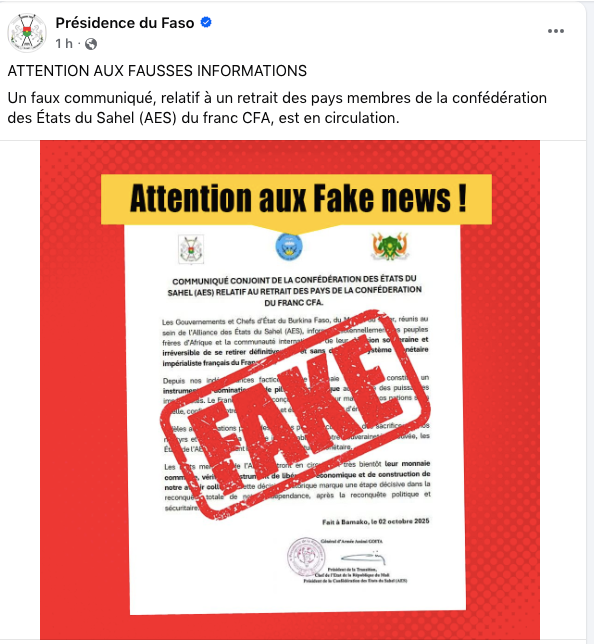 Quelques heures après cette publication, la présidence du Faso à travers sa page Facebook a apporté un démenti en ces termes « ATTENTION AUX FAUSSES INFORMATIONS :  Un faux communiqué, relatif à un retrait des pays membres de la confédération des États du Sahel (AES) du franc CFA, est en circulation ».