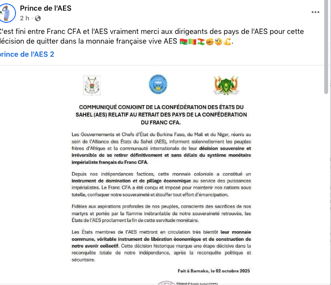 Un communiqué devenu virale sur les réseaux sociaux Facebook et WhatsApp en date du 2 octobre 2025 et attribué au Président de la transition du Mali, par ailleurs Président de la Confédération des États du Sahel (AES) annonce le retrait de ces pays à savoir le Mali, le Burkina Faso et le Niger du franc CFA.